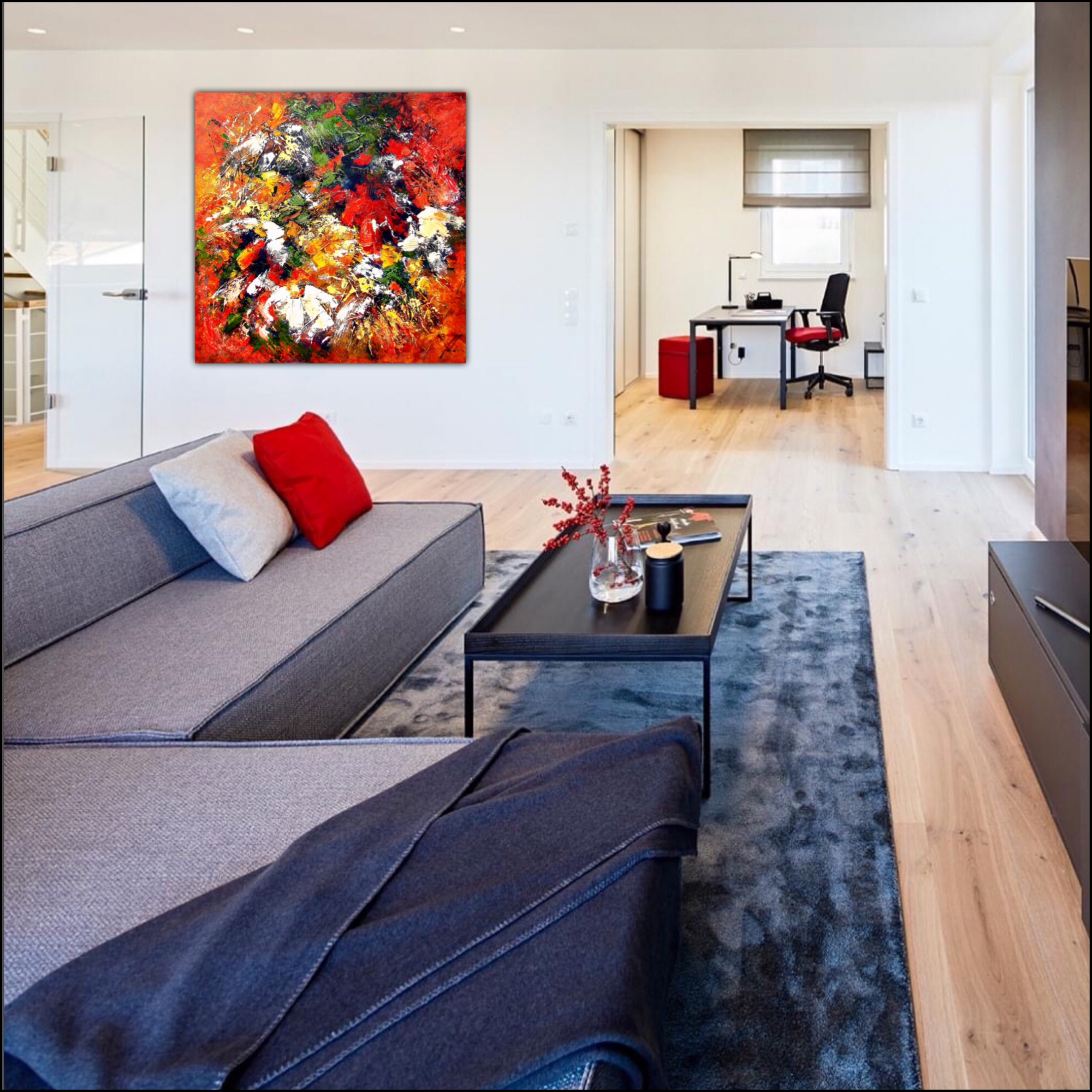 In dit werk vloeien meerdere tinten rood en expressieve penseelstreken samen tot een compositie die energie uitstraalt. 'Krans van Bloemen' nodigt uit tot mijmeren, tot voelen — een ode aan de liefde in al haar vormen.